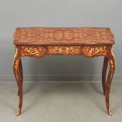Schrijftafeltje met drie laden in het front, belijmd met diverse houtsoorten en bloemmarqueterie, en voorzien van verguld metalen beslag, Louis Quinze-stijl, 20e eeuw, 75 × 97 × 51 cm