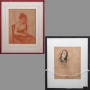 François Bonvin (1817-1887), zittende vrouw, roodkrijttekening, r.o. gesigneerd, verso een schets van vrouw met kap, houtskool op papier, 31 × 24,5 cm