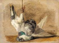 Schilderij: dode duif, olieverf op board, r.m. gesigneerd F. Verster, maar niet van de hand van Floris Verster, 29 × 39 cm
