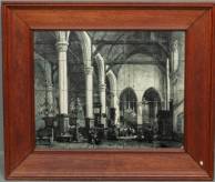 20-pas tegeltableau met sepiakleurige voorstelling van het interieur van de Grote Kerk te Edam, naar een schilderij van Johannes Bosboom, uitvoering Plateelbakkerij Rozenburg, Den Haag, 62 × 77,5 cm, in originele eikenhouten profiellijst 93 × 108 cm, het schilderij van Bosboom bevindt zich in de collectie van het Stedelijk Museum, Amsterdam (inv.nr. A 2197)