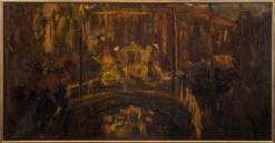 Hermanus Antonius 'Henri' van Daalhoff (1867-1953), de Gouden Koets op boogbrug, vermoedelijk de intocht van koningin Wilhelmina met Koningin-moeder Emma in 1898 te 's-Gravenhage, olieverf op doek, niet gesigneerd -craquelé, klein stukje verfverlies-, 52 × 99 cm
