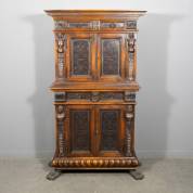 Vierdeurs mahonie kastje met boven elk deurtje ook een kleine lade, het geheel rijkelijk voorzien van bronzen beslag, waaronder kariatiden en klauwpoten, modern -demontabel in onder- en bovenkast-, 157 × 92 × 38 cm