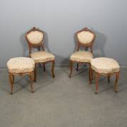 Twee notenhouten stoeltjes en twee bijbehorende krukjes met gesneden rocailles en bladmotieven, eind 19e eeuw