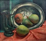 Willem van Leusden (1886-1974), stilleven met peren, glas en tinnen schaal, olieverf op doek, r.o. gesigneerd en gedateerd 1942 -beetje vuil-, 30 × 36 cm