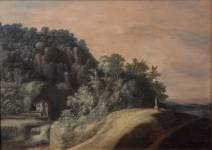 Schilderij: landschap met waterval en landweg, olieverf op paneel, niet gesigneerd, 19e eeuw of eerder -ingekort aan rechterzijde, vrijwel geheel overgeschilderd-, 33,5 × 47 cm