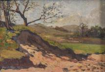 Hugo Polderman (1886-1977), heuvelachtig landschap, olieverf op board, niet gesigneerd, achterzijde met annotatie 'Schilder Polderman Apeldoorn', 22 × 30 cm