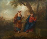 Omgeving Benjamin West (1738-1820), Christus en de Samaritaanse vrouw bij de Jacobsbron, olieverf op doek, niet gesigneerd -inschilderingen, slijtage in de marges-, 72 × 87 cm, daarbij: catalogusomschrijving van Christie's uit 2012, herkomst: Christie's, veiling 29-1-1969, lotnummer 6, destijds geveild als Francis Wheatley (1747-1801)