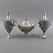 Paar tinnen kastanjevazen, en ovale dekselvaas, 19e/begin 20e eeuw, 29 × Ø 13,5 cm