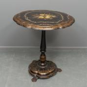 Met papier maché bekleed bijzettafeltje, het opklapbare gecontourneerde blad deels ingelegd met parelmoer, 19e eeuw -gebruikssporen-, 73 × 70 × 59 cm