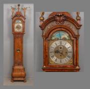 Amsterdams staand horloge in wortelnotengefineerde kast, met secondewijzer, datumaanduiding, maanstand en speelwerk van vier Engelse melodieën op tien bellen, gesigneerd Denijs Audebert, circa 1730 -speelwerk van later datum-, 274 × 57 × 38 cm inclusief beelden