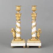 Paar wit marmeren en verguld bronzen kandelaars, in de vorm van door bloemen omgeven zuilen met dansende cherubijnen, Frankrijk, midden 19e eeuw, 31,5 × 11 × 11 cm