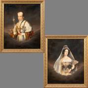 Paar oleografieën: portret van Ferdinand I van Oostenrijk (1793-1875), Keizer van Oostenrijk en Hongarije en Bohemen, etc., en portret van Maria Anna Carolina, keizerin van Oostenrijk, Koningin van Hongarije en Bohemen, etc., heruitgave van Gustav Simon, Wenen, door A. Berka & Comp., 33,5 × 27 cm