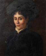 Schilderij: portret van vrouw in zwarte kleding, olieverf op doek, niet gesigneerd, eind 19e/begin 20e eeuw -verfverlies, scheurtjes in verflaag-, 60 × 49 cm