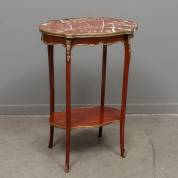 Ovaal beuken en mahonie bijzettafeltje met gecontourneerd rood marmeren blad en messing beslag, 74 × 53 × 35 cm