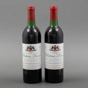 Paar flessen rode wijn: Château Laroze, Saint-Émilion, 1985 -vulniveau: top shoulder-