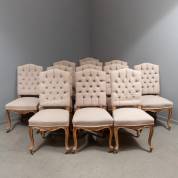 Twaalf gestoomde notenhouten eetkamerstoelen met lichtgrijze stoffering en gecapitonneerde rug, de voorste poten met zwenkwieltjes, uitvoering H.F. Jansen, Amsterdam (gestempeld onder de bekleding), eind 19e eeuw