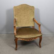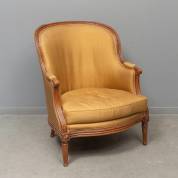 Gesneden beukenhouten bergère bekleed met lichtbruine stof, Louis Seize -één armleuning sleets-