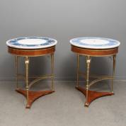 Paar gueridontafeltjes afgedekt door witte natuurstenen bladen met blauw decor, het onderstel met drie messing poten in de vorm van kariatiden en verbonden door galerijrand, empirestijl, 20e eeuw -gaatje in blad en voet, vermoedelijk voor verlichting, gebruikssporen-, 89 × Ø 75 cm
