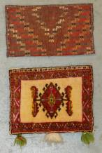Turkmeens kelimkussentje, eind 19e/begin 20e eeuw, en Perzisch kussentje Kaskay, grootste 35 × 27 cm