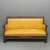 Mahonie tweezits bank, de armleuningen met gesneden leeuwenkoppen, de rug en zitting bekleed met geel satijn, laat empire -oude breuk bij één armleuning, enkele ontbrekende ornamenten, defecten in bekleding-, 90 × 166 × 69 cm