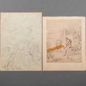 Twee tekeningen: Johann Heinrich Ramberg (1763-1840), 'Das [?] Spiel [...] Trastevere zu Rom', houtskool op papier, niet gesigneerd -scheur-, 24 × 20 cm, en schetsblad met figuurstudies, niet gesigneerd, vermoedelijk 19e eeuw, 32 × 23 cm