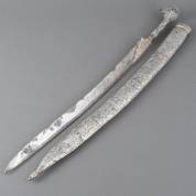 Yatagan in BWZG schede met rijk reliëfdecor van dieren en bloemen, de kling met gedamasceerde teksten en tughra, Ottomaanse rijk, 19e eeuw -schede deels opengescheurd-, totale lengte 75 cm