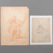 Twee schetsbladen: Atlas, rood krijt op papier, 17e eeuw -vlekjes-, 35 × 26 cm, en blad met enerzijds compositietekening van vrouwenportret en anderzijds man met baard en enkele bedragen, houtskool op papier, circa 1700 -randen afgeplakt-, 27 × 21 cm