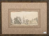 Hollandse School: dorpsgezicht Leusden, gewassen inkt op papier, niet gesigneerd, met annotatie: Leusden 23 aug 1735 -vlekjes-, 10 × 20 cm