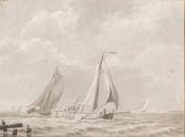 Johannes Hermanus Koekkoek (1778-1851), zeilschepen op zee, sepia op papier, l.o. gesigneerd in balk, 16,5 × 21,8 cm