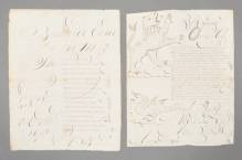 Vier geschreven heilwensen, de marges versierd met decoratief penwerk: in één vloeiende beweging neergezette figuren en krullen (Bijbelse taferelen, een leeuw, draak en olifant),1731-1779 -éénmaal gevouwen-, 42 × 33 cm