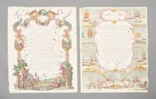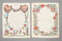 Twee geschreven heilwensen omgeven met gegraveerde en gekleurde bloemenkransen, één prent toont aan de onderzijde een tafereel van een boerenkermis. Geschreven door Jan de Jong, oud 8 jaar, 1775; de andere prent geschreven door Jan vander Kemp, 1755, -vouwsporen- 42 × 33 cm