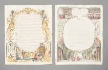 Twee geschreven heilwensen geschreven door Anna Franken. Midden 18de eeuw. Eén blad toont taferelen van de walvisvangst, het andere een dorpstafereel, beide gekleurd, -vouwsporen- 42 × 33 cm