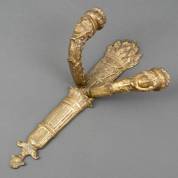 Bronzen tweelichts wandkandelaar, de kaarsenhouders met decor van vrouwenhoofden, de wandsteun in de vorm van een fakkel, 19e/20e eeuw, 42 × 22 × 13 cm