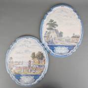 Paar polychrome aardewerk wandplaquettes met plattelandsdecors, 19e eeuw -enkele kleine glazuurdefecten-, 58 × 49 cm per stuk