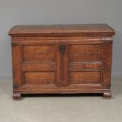 Eiken panelenkist met gekerfd bloemdecor, 18e eeuw -gebruikssporen-, 72 × 126 × 72 cm