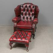 Rood lederen oorfauteuil met voetenbankje, Chesterfield-stijl, uitvoering Springvale, daarbij: kussen
