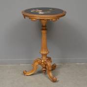 Rond bronsgeschilderd houten tafeltje op driespantpoot, met pietra dura blad met voorstelling van rozen en roodborstje, 19e eeuw -blad gebarsten, loszittende en ontbrekende delen-, 80 × Ø 52 cm