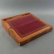 Noten en mahonie schrijfkist met ingelegde biezen en meanders, het interieur met vakjes, laatjes en donkerrood schrijfblad, eind 19e/begin 20e eeuw -deukje rechtsvoor, verder in goede en complete staat-, 17 × 50 × 26 cm