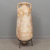 Romeinse aardewerk transportamfoor, type Keay 16, Hispania Lusitania / zuidwestelijk Iberisch schiereiland, 3e tot 5e eeuw n.Chr. -zeepatina, punt onderin niet helemaal compleet, enkele defecten dichtgesmeerd met op zeepatina lijkende pasta-, 88 × Ø 35 cm, in metalen houder