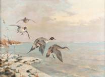 Jo Schrijnder (1894-1964), wintergezicht met opvliegende eenden, olieverf op doek, l.o. gesigneerd, 60 × 80 cm