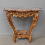 Verguld houten wandconsole met marmeren blad, het onderstel versierd met hond die op eend jaagt, Louis Quinze -restauraties, chip van marmeren blad, enkele verbindingen gelijmd-, 85 × 89 × 57 cm