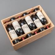 Twaalf flessen rode wijn: Château Haut-Logat, Haut-Médoc, 1983, in houten kist -vulniveau: 1× high shoulder, de rest top shoulder of hoger; etiketten enigszins verweerd-