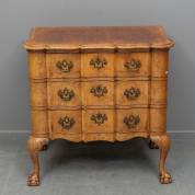 Wortelnoten commode met drie lades, orgelgebogen front en bronzen beslag, staand op bolklauwpoten, 19e eeuw -lichte gebruikssporen, aan de rechterkant ontbreekt een stukje ring, verkleuringen-, 85 × 85 × 50 cm