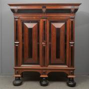 Ebben- en palissandergefineerde eiken kussenkast, de kap voorzien van drie leeuwenmascarons, Gelderland, tweede helft 17e eeuw -interieur en achterwand gereconstrueerd, enkele stukken inlegwerk ontbreken-, 217 × 188 × 75 cm