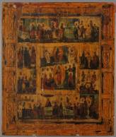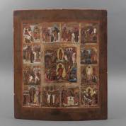 Russisch-orthodoxe feestdagenicoon, met centraal de herrijzenis van Christus en de Nederdaling ter helle, tempera op paneel, 18e/19e eeuw, 52 × 45 cm