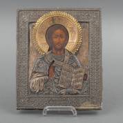 Russisch-orthodoxe icoon: Christus Pantocrator, tempera op paneel, met messing oklad, 19e eeuw, 31 × 26 cm