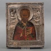 Russische icoon: Sint Nicolaas, tempera op paneel, met BWZG oklad -oklad defect-, 32,7 × 28 cm