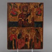Oosters-orthodoxe icoon: bovenin Moeder Gods Hodegetria, daaronder vier apostelen, tempera op paneel, vermoedelijk eind 16e/begin 17e eeuw, 31,7 × 24 cm