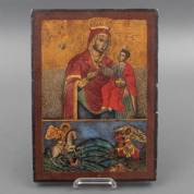 Grieks-orthodoxe icoon: Moeder Gods Hodegetria, daaronder links Sint Joris en de draak en rechts de heilige Demetrius, Ionische / Heptanese School, tempera op paneel, eind 18e/begin 19e eeuw, 41 × 29,5 cm