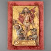 Gesneden houten tabernakeldeurtje met polychroom decor van de wederopstanding van Jezus Christus, 17e/18e eeuw -één arm ontbreekt, verfverlies-, deurtje 40,3 × 27,3 cm